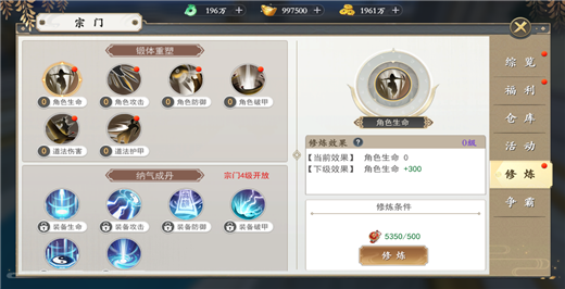 通过宗门活动玩法获得修练值,可自由选择宗门修炼属性。