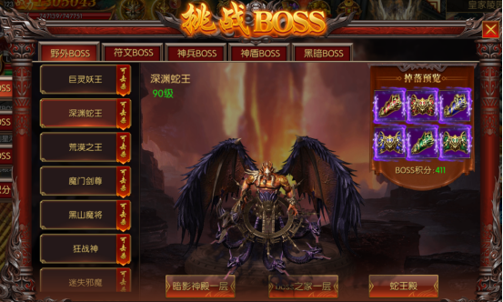 活跃于《龙腾天下》的各个野外地图、初级和中级打宝地图上的主要是100级的boss,比如蛇王殿的深渊蛇王和魔龙殿的冰封魔王等。虽然他们的战斗力并不强大,但想在游戏的早期阶段挑战成功,就需要带上相应的药水,否则可能会不小心被击败。