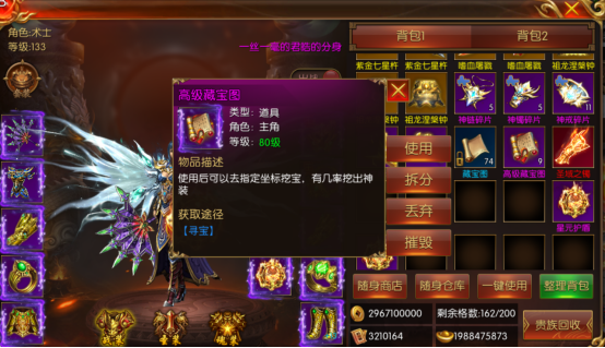 1、分为普通与高级两种藏宝图,点击使用后,只要跟随指南针的指向前往指定地方挖宝,就有可能找到神装。