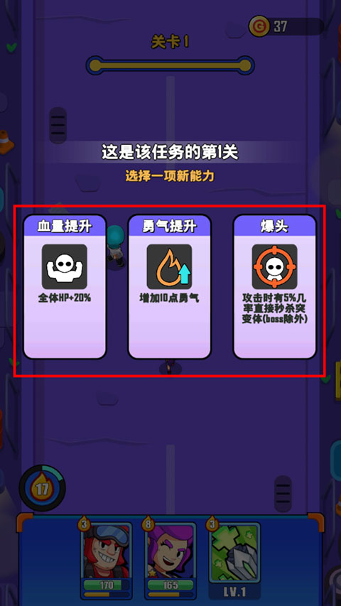 3、消灭一波僵尸,能够选择一项新能力,如下面的血量提升、勇气提升和爆头;