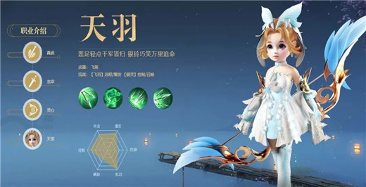 职业特点:天羽弟子能以飞箭啸鸣百步之外杀人于无形,又能召得奇兽相随、以一当十横扫千军,更能将身形化于天地灵气中,悄无声息地接近或是远离对手,成为最可怕的存在