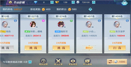 “华山论剑”这个副本每天都会进行结算,在第二天你会得到相应排名的奖励和积分,这样你可以用获得的积分在积分商城换取你所需要的材料。当然在游戏中可能会遇到前面两位的总战力都会比自己高但是自己又想赢得经验,那这时你可以用一千银币来刷新你前面的玩家,这样有可能会有更大的惊喜。但是“华山论剑”这个副本一天只有5次免费的挑战机会,所以这时就要用手中的银币刷新挑战列表来进行最合算的挑战,以获得最多的经验值。