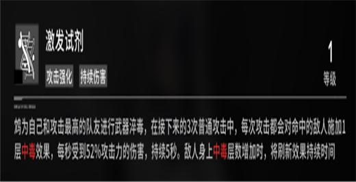 技能LV.2(心智等级2)时中毒效果将会使敌人每秒受到70%攻击力的伤害