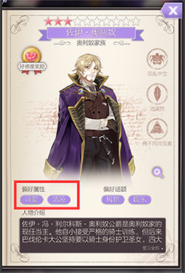 像【奥利奴公爵】喜欢【可爱】和【清凉】相关属性的服装,那么即使分数稍低,也可以搭配突出这两个属性,这会有很大概率在进入舞会的时候直接引发公爵动心,使得你不用随机闲逛,直接找人就能和公爵对话。而且在闲聊中,他偏好的属性越高,就越容易引发他动心,获得奖励,或者完成任务。