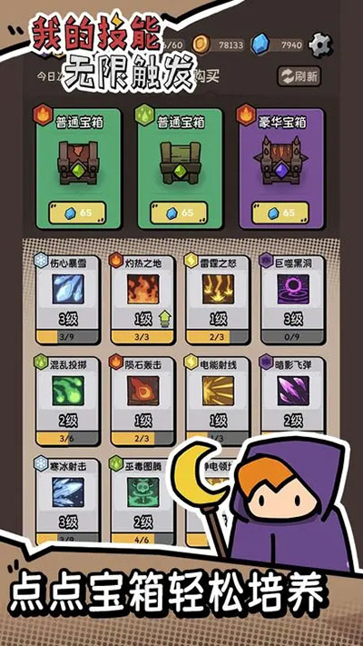 我的技能无限触发游戏是一款款Roguelike风格的手游融合了经典游戏《弓箭传说》和《暗黑破坏神2》中的击中触发技能机制,为玩家提供了一场极具挑战性的冒险之旅。该游戏的核心亮点在于其独特的技能触发系统,它不仅让每一场战斗充满了不确定性,也大大提升了战斗的观赏性和玩家的沉浸感。在这里,你的攻击动作可能会触发一系列连锁技能效果,每个技能都拥有独立的触发几率,搭配上游戏中鲜明的属性特征,战斗过程变得异常扣人心弦。