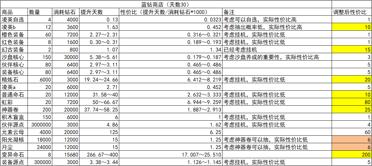下面我们再来看看蓝钻商店商品对应的时间价值和性价比,最后根据备注进行调整,和数字取整,取平均等操作,最终得到的蓝钻商店商品性价比如下。