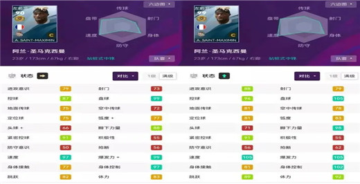 他的满99的双速惊人,99的身体控制,总能出奇不意地以他的技术发动突袭,凭借顶级的爆发力 超强的身体控制能力,手感好过人还是不错的。盘带极强,就是体能差点。