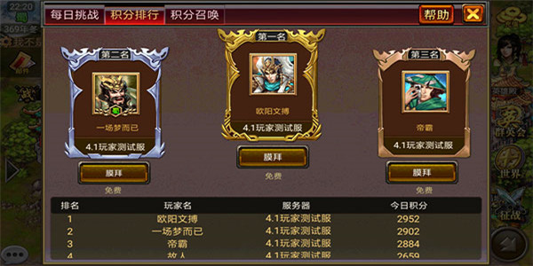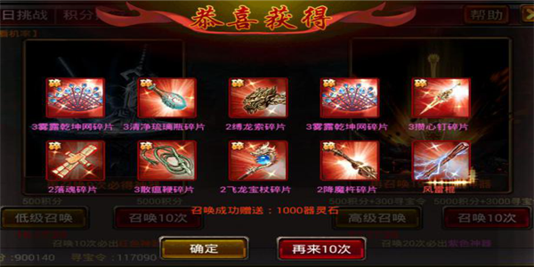 每日挑战中每天能获取积分,特别是挑战十的武将,打的伤害越高,积分奖励越多。积分可以用来兑换神器,如果弄红色神器。基本上三天的积分就够在积分兑换里搞一个红色神器,紫色神器的话每次召唤需要在500积分的基础上再增加300寻宝令,红色的只需要积分足矣,下面是500积分低级召唤的截图(免费的) 。