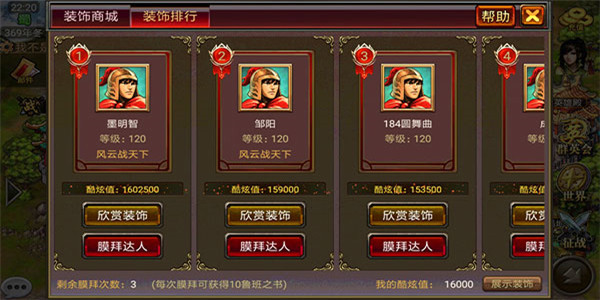 增加了几个新的装饰和一个装饰排行,也有一个膜拜的按钮,装饰商城大家都知道,装饰排行中有酷炫值排行,可以看本服的装饰酷炫排行,也可以点进去看对方主城,这些不重要,对咱们没用。有用的是膜拜能获取到大家需要的资源,这里提醒下,大家别遗忘了。