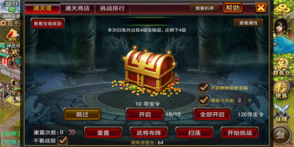 这种设计虽然美观但有点不好,星级一目了然,就是感觉太花眼了。通天更爽,增加了不看战报,这项相信大家都很喜欢,直接全点就好了,开宝箱也可以设置每层开多少,直接一次性开固定的数量,然后点击全部点开就好了。绝对人性化的优化,赞赞赞!