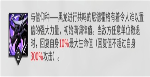● 被动:增加了开局调律值,使得黑龙可以占据一二号位和开局控制主要原因,且敌方角色撤退时,尼德霍格将恢复百分比生命值,增加了黑龙的身板使得在前排能控能抗。