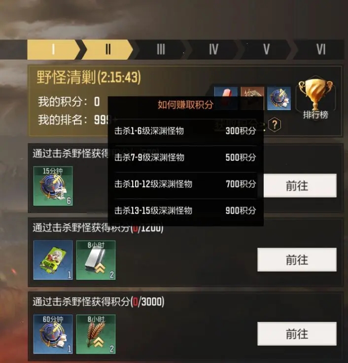 其中击杀1-6级深渊怪物可获取300积分,击杀7-9级深渊怪物可获取500积分,击杀10-12级深渊怪物可获取700积分,击杀13-15级深渊怪物可获取900积分。