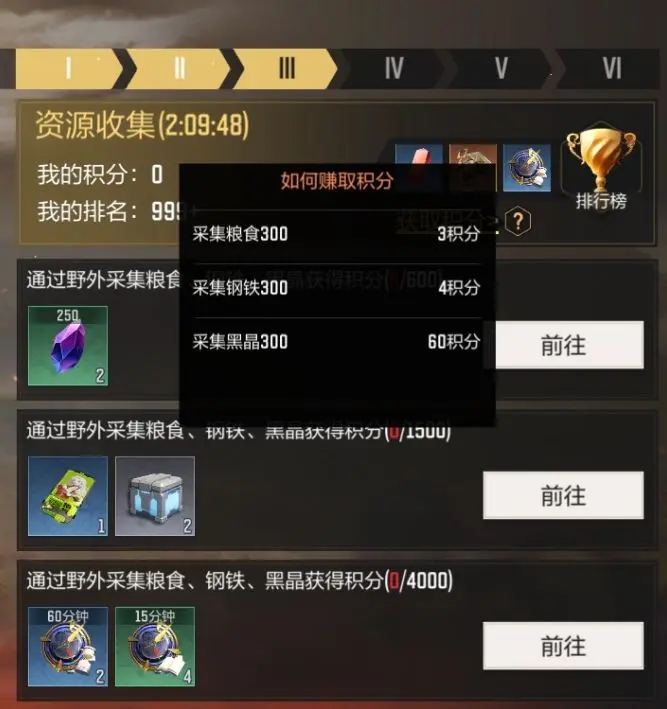 3、活动第三天为资源收集,采集粮食300可获得3积分,采集钢铁300可获得4积分,采集黑晶300可获得60积分。