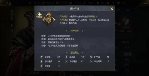首先我们先科普一下游戏中投石车兵种的基本属性。游戏中投石车是对建筑物伤害最高的兵种,投石车在国战中的作用至关重要,攻城拔寨,国战中投石车是最容易成为被敌军攻击的目标。