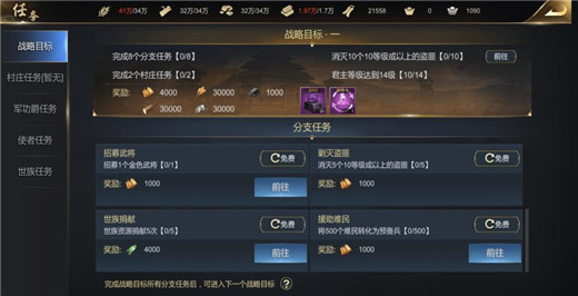 战略目标,是通过完成各个小任务,已达成最终目标奖励的一个环节。由于最终奖励相同,所以大家的差距都出现在了“分支任务”上。以上图为例:每个分支任务的奖励是不同的,我们可以分为:“刀币”、“资源”、“经验”三类。如果想要快速提高等级,只做可以获得“经验”的任务,再将其他奖励的任务刷新为“经验”奖励。所以大家看出上图的任务应该怎么做了吗?(先做三个送经验的任务,再将最后一个赠送刀币的捐献任务,刷新为经验任务再做喔。如果招募橙将任务太难,可以将击杀盗匪任务做完后,将招募橙将任务刷新为击杀盗匪哈)