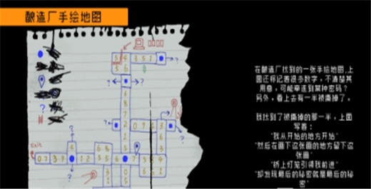 酿酒厂密码是比较简单就能找到的,但是还是需要动一些头脑的,相比其他游戏繁琐的解迷环节来说这个基本上就是已经把答案提示出来了,游戏中玩家会收到一条消息,根据半张手绘地图提示我们可以得出密码是0755。