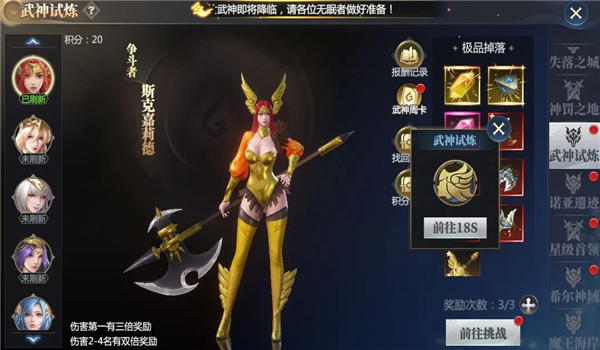 3)武神试炼每日又次数限制,想要尽快为女武神攒齐强大的圣物的话,可以购买武神周卡,激活立得钻石,且7日内每日都可以领取绑钻和武神试炼次数卡,增加挑战次数~
