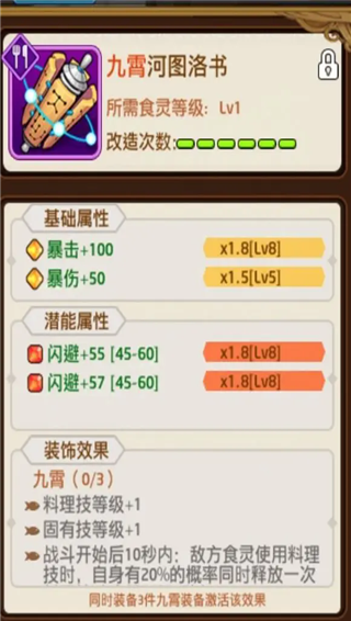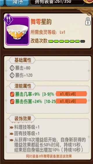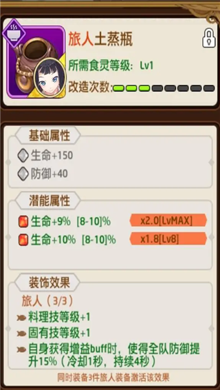 旅人:乍一看提升防御好像只适合给主食?戳啦,这个机制最重要的在于能不断启动蛋黄酱,1sCD永远滴神从而快速叠伤害,目前升华了天妇罗的肯定必搞一套的,增伤效率远快于其他装备。给需要防御的主食用反而有点浪费了,属于是任意辅助都可以带的,总之优先蛋黄酱食灵和蛋黄酱食灵的队友。多多益善,根据自己的能力抽吧。