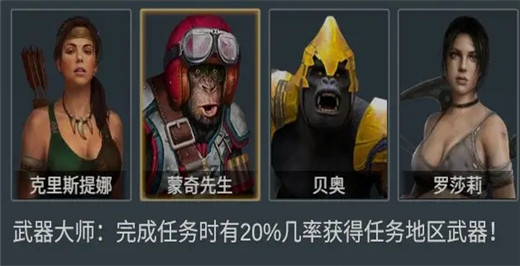 而我们文武双全的【蒙奇先生】更是拥有“武器大师”的特殊属性:完成任务时有20%几率获得任务地区武器!