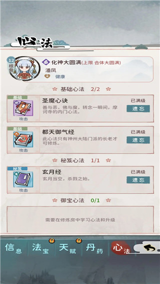 心法学习消耗灵石挺大,不建议给邀请或者俘虏 招降来的弟子使用,这两类不能传功,六维不高 不值得培养。注意遗忘心法没有任何补偿,没了 就没了