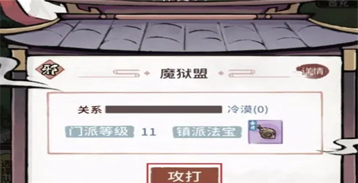 游戏的第一次攻打门派在新手期,你需要攻打魔狱盟,这是游戏中战斗力比较弱的一个邪派。也就是17级邪修联盟的任务,玩家直接点击世界地图找到魔狱盟,然后点击敌方的门派界面,选择攻打,这个任务作为主线的话比较简单,也不能跳过,所以不会对你和其他门派的关系有什么影响。