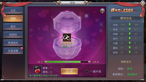 当然爱情戒指是必不可少的,这是浪漫的象征,可以在绑元商城购买。结婚后变为结婚戒指,离婚后会变为结婚戒指(离),同时戒指会带来大量的属性加成,需要消耗爱情果实来升级戒指,而爱情果实则通过情缘副本,珍爱锦囊还有举办酒席获得。夫妻双方同时在线时可以激活被动技能比翼双飞的效果,这技能名就让小编吃了满嘴的狗粮啊。