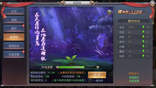 “在天愿做比翼鸟,在地愿为连理枝”,夫妻两人为对方种下一颗相思树,这实在是浪漫到不行啊。升级相思树消耗的相思豆可通过情缘副本和珍爱锦囊获得,达到一定等级可激活属性加成,提升战斗力。与羁绊一样,离婚后保留相思树的等级与属性,百分比加成取消,不可继续培养。再次及婚后根据伴侣双方相思树等级重新激活各项属性加成与培养。