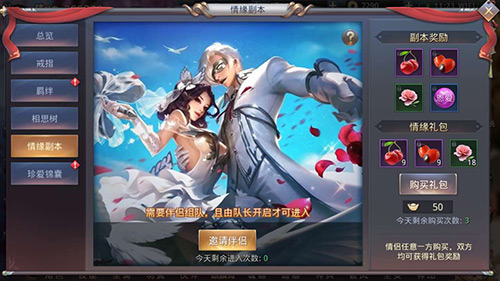 能与另一半一起畅快的刷副本,这是多么愉快的一件事,情缘副本,伴侣每天可以组队进入一次情缘副本,击败副本中所有的怪物即通关。在副本中每5秒可获得2点恩爱值,提前离开副本将无法获得后续恩爱值奖励。通关情缘副本后,伴侣双方可花费元宝额外购买情缘礼包,其中一人购买,双方都可以获得,这是在小怪面前秀恩爱啊,别人副本靠打,情侣就靠秀。