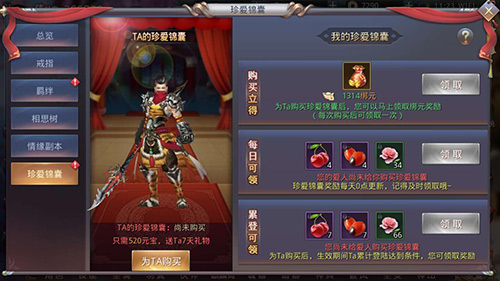 结婚后,可花元宝为伴侣购买珍爱锦囊,购买方可立刻获得1314的绑元奖励,真是羡煞旁人啊,连奖励都这么浪漫!而收礼的一方每天可以领取奖励持续7天,累计登陆达到天数后,送礼方可领取奖励,所以,爱她就给她买珍爱锦囊,为爱情保鲜升温。