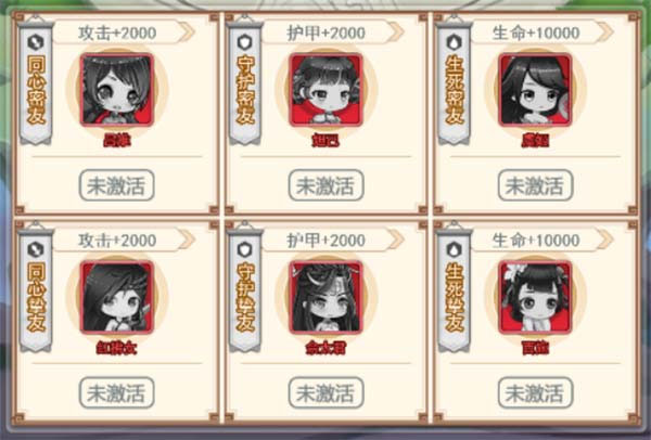 至于最后,就是武将羁绊,武将羁绊分为两种:① 闺中密友羁绊;② 情缘羁绊。两种羁绊相同的是,获得指定英雄后,激活特定的羁绊可以获得属性加成;不同的是闺中密友羁绊给予的属性加成是固定加成,情缘羁绊还能与指定的装备产生羁绊,并且情缘羁绊提供的属性加成都是百分比加成。由此可见,情缘羁绊在中后期显得尤为重要,前期闺中密友羁绊也是必不可少的。