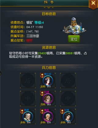 3、一个高等级的银矿可以每小时为我们提供大量的银两,而一个正在被人开采的银矿在被我们攻打下来之后,更是可以直接夺取对方当前开采量一半的银两,不过这种方法需要耗费很多精力去寻找,因此我强力推荐另一种快速获得银两的方法,那就是挑战