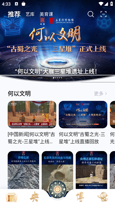 1、下载进入央博app后,下方总有五个导航栏,首先便是app首页,通常都会推荐一些报导;