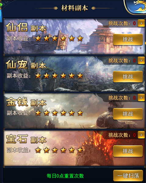 材料副本包括升星副本、宝石副本、金钱副本、仙侣副本、仙翼副本、仙宠副本、仙兵副本