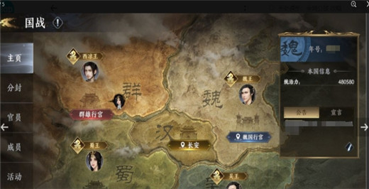 首先给大家概述一下的国战是什么,国战是一种跨服玩法,每个赛季都会刷新,玩家可以加入魏蜀吴群四个阵营,选中加入之后就会和其他三个阵营的玩家成为敌对关系,之后玩家会参加国战,进行国与国的对抗,赛季的主要流程就是选国家、建国、之后开始对抗。