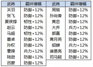 上图中罗列了所有120资质武将能够从羁绊系统中获得的属性增幅。除了兵力、攻击和防御外,前排武将的羁绊中还额外提供韧性增幅,相比之下,张飞羁绊对于兵力的增幅更是达到了56%,不禁让人眼前一亮。中排武将的对比中,孙权羁绊所增加的兵力和攻击非常显著。最后我们转眼于后排,羁绊系统提供给司马懿的兵力和攻击增幅都比较低,这也间接解释了为什么司马懿太阴神雷的群攻效果为何要逊色于孙尚香。