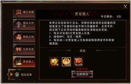 首先是每天的“赏金猎人”活动,虽然目标单一,完成起来时间够短,但金钱收益却十分可观,几乎可以说是玩家每天上线必做的任务。