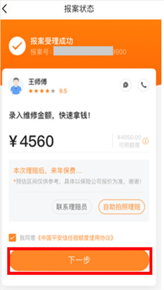 车险信任赔是平安推出的车险理赔服务。用户可凭借信任额度体验极速,极简的单车事故理赔。其使用步骤如下:第一步∶报案成功后,符合条件的用户系统会为其自动匹配信任赔通道,请在额度范围内录入维修金额,然后点击“下一步"按钮