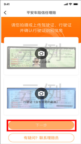 第三步:上传驾驶证、行驶证照片,然后点击“下一步"按钮