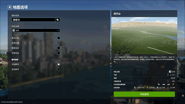 5、在此界面,进行您所选地图的详细设定,调整完毕后点击“开始游戏”按钮以开始您的建设;