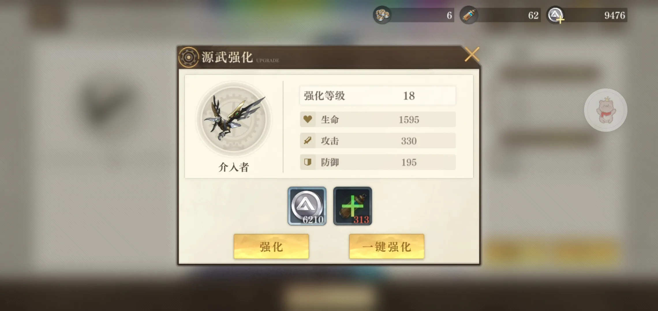 提升战力小技巧: 先推图,然后达到等级解锁队伍人数。积攒的源晶和邀请函用来抽取角色,有了角色之后就可以进行配队,尽培养比较有优势的角色,可以选择平民一点的比较好培养。先给角色升级,然后进修,在升级角色的同时也不要忘了进修哦!凭证可以用体力来扫荡或者商店购买。然后就是强化源武和通过制造来获得武器来改造。角色觉醒的碎片,可以通过赠送礼物来提高好感度,好感度的提升到一定等级会获得角色碎片,可以用于觉醒哦!