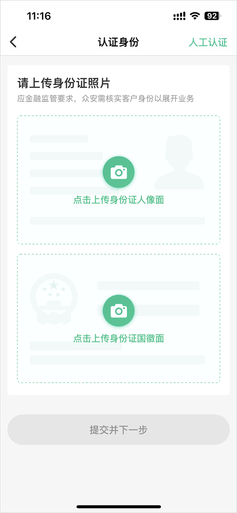 5、选择身份证照片认证,上传身份证正反面照片,提交完成认证。