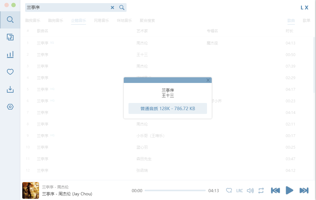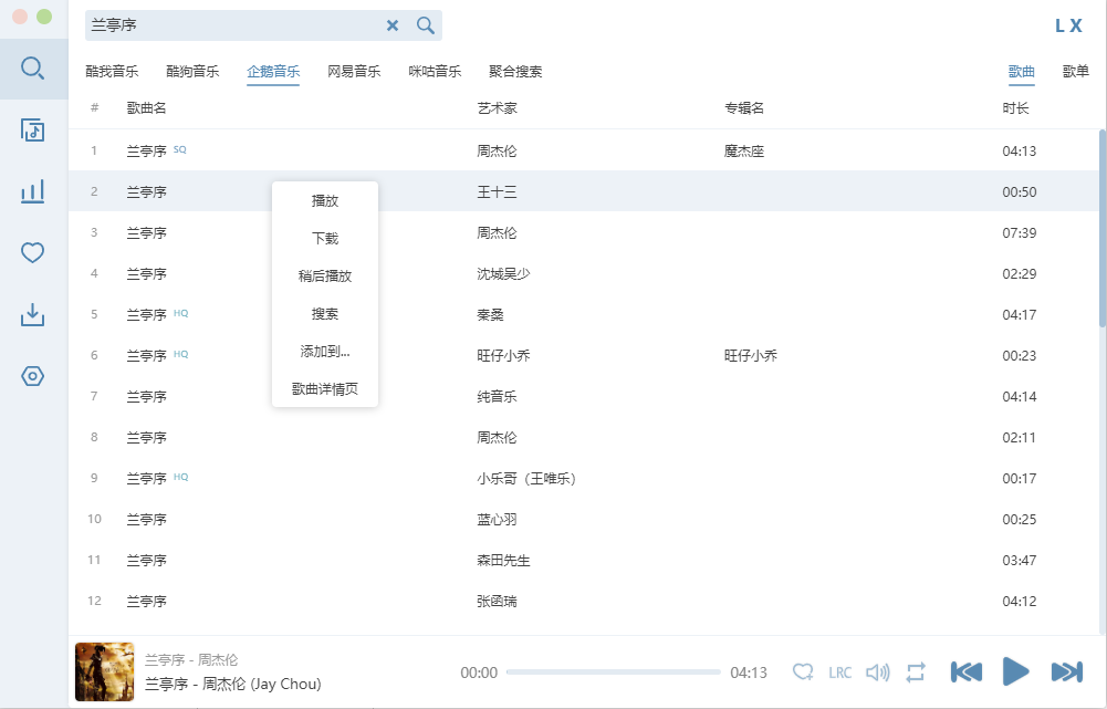 例如,输入“周杰伦”。洛雪音乐助手将迅速展示相关的歌曲列表,从中选择你想听的歌曲进行播放。