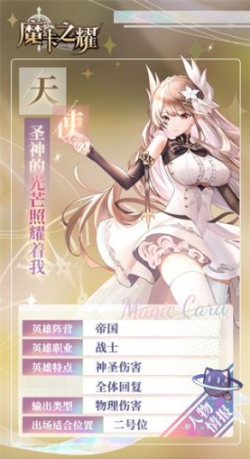 天使角色在游戏中的【七日巡礼】活动中初次亮相。玩家完成任务积分后,可获得【天使-体验卡】和【SSR英雄-天使】。英雄阵营:帝国