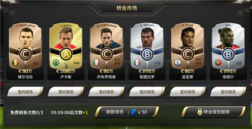 转会市场每日有三次免费刷新球员次数,玩家可点击球员查看属性,仔细挑选自己想要的球员。这边要提醒玩家的是,可要根据球队位置招募球员,一支球队只有前锋,没有防守球员也是不行的哦!