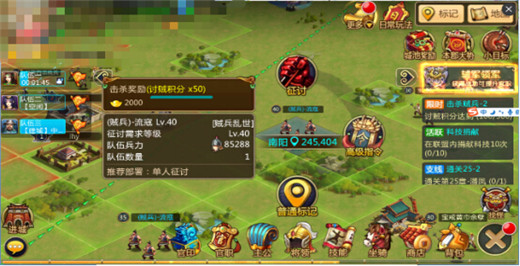 首先在排兵布阵方面,建议把队伍分散开,驻扎在不同的县城(贼兵在城池附近会成批的刷新)附近,方便寻找目标。