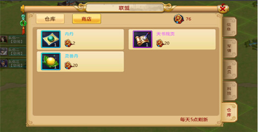 联盟仓库可以把不用的装备材料等放入仓库,但盟友取出需要一定的联盟贡献,在联盟商店中可以使用贡献换取内丹,灵兽丹与天书残页等道具。