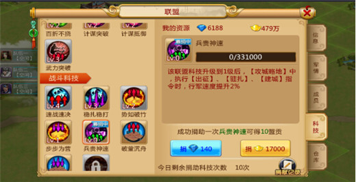 联盟科技可以增加联盟成员在攻城略地当中的属性,可由盟主开启,开启后需要联盟人员进行资金捐献升级。
