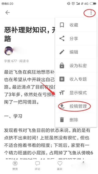 3、打开所要投稿的文章后,点击屏幕右上方的竖排三个冒号的图标,可以看到有一堆下拉菜单。选择【投稿管理】,一般来说,一篇文章有向5个专题投稿的机会,可以同时向多个专题进行投稿哦!