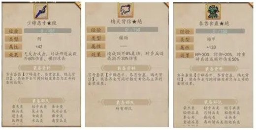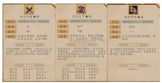 雌雄双股剑【精】+倚天剑【精】=【分天双股★绝】 效果:加强攻击 50%,防御 25%,反击后反击,反击+50 戡乱【精】+汉王凯【精】=【大汉天下★绝】