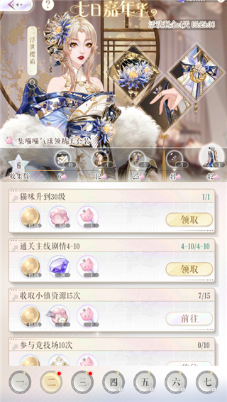 完成任务目标可以获得道具奖励和喵喵气球,集齐指定数量的喵喵气球可免费领取丰厚的进度奖励,包含高级时装10连抽及五星精美套装《浮世樱霜》。